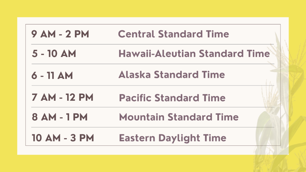 All times are Central Standard Time (CST). Conversions: 9 a.m.-2 p.m. Central ST; 5-10 a.m. Hawwaii-Aleutian ST; 6-11 a.m. Alaska ST; 7 a.m.-Noon Pacific ST; 8 a.m.-1 p.m. Mountain ST; 10 a.m.-3 p.m. Easter Daylight Time.